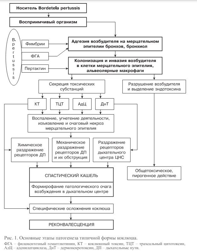 Входными воротами инфекции является слизистая оболочка респираторного тракта. Возбудитель коклюша, палочка Bordetella pertussis, проявляет тропизм к клеткам мерцательного эпителия и размножается на их поверхности, не проникая в кровоток. Этот процесс обычно длится 2-3 недели и сопровождается выделением ряда сильных экзотоксинов, основными из которых являются коклюшный токсин (КТ) и аденилатциклаза.